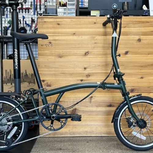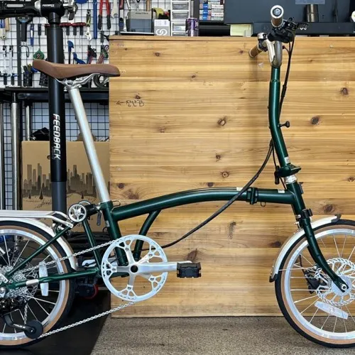 근데 이건 달라요. 크로몰리 트라이폴드 프레임에 시마노 유압 디스크 브레이크까지 — 로드바이크 입문자들이 탐내는 스펙을 접이식 자전거에 그대로 넣어놨어요. 다크 그린 컬러가 그냥 멋있고요.