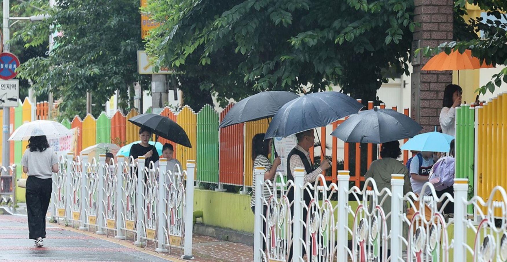 제주 지역 장마가 시작된 날, 어린이들이 우산을 쓰고 등교하는 모습 (2024년 6월 제주 노형초등학교 앞). 2025년에도 비슷한 시기 장마가 찾아올 전망입니다.